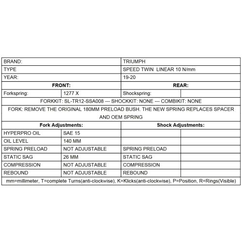 These linear fork springs are perfect for achieving a sporty fork set-up for the Triumph Speed Twin. The BLACK-T Springs give the fork much greater reserves under braking conditions. The sportier setup gives much more precise feedback from the fork when cornering your Speed Twin. A sport upgrade with improved response and higher reserves at the limit. Ideal in combination with the Black-T shock absorbers.