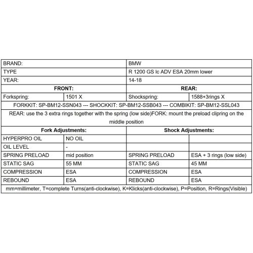 The height lowering replacement springs has been designed to match the BMW R1200GS (LC) Adventure perfectly This spring set provides you with a -20mm reduction in height without affecting the riding properties - at the expense of a little ground clearance. The progressive springs have been designed to match the original shocks BMW R1200GS (LC) Adventure perfectly, and offer good response and safety in extreme situations. The balance of your motorcycle remains fully intact..