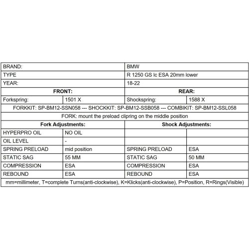 The height lowering kit by Touratech Suspension. The set includes replacement springs for the shock absorber front and rear. This spring set provides you with a sensible reduction in height without affecting the riding properties - at the expense of a little ground clearance. The progressive springs have been designed to match your motorbike perfectly, and offer a tremendous improvement in response and greater safety in extreme situations. Replacing the front and rear springs will lead to a significant improvement in your suspension system. Street legal.