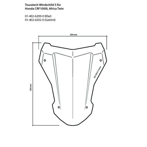 Replace your original windscreen with the Touratech wind shield and discover much better driving properties! The form and function of the upper edge of the wind shield is based on our rally experience. The aerodynamic optimization guides the air streams over the head of the pilot without unnecessary turbulences. So, the wind shield is not only flatter-free, it also guarantees a relaxed driving pleasure that doesn't exhaust the pilot nor the pillion passenger.